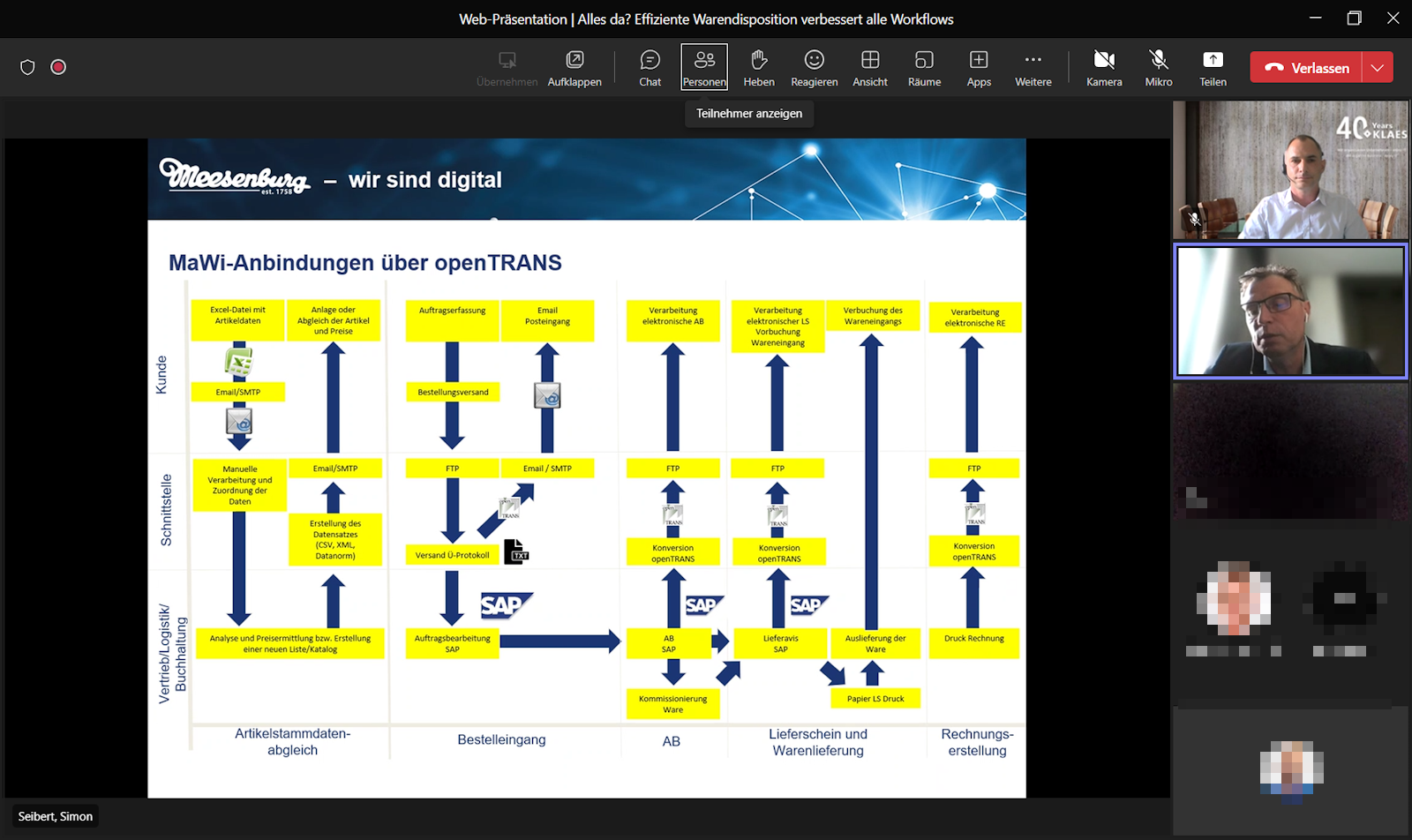 Lutz Geburzky (Klaes Vertrieb) und Simon Seibert (Meesenburg Direktor Digital) präsentierten am 4. Juli die Themen Bestellwesen, Materialwirtschaft und openTRANS - die digitale Power für effiziente Workflows im gesamten Unternehmen.