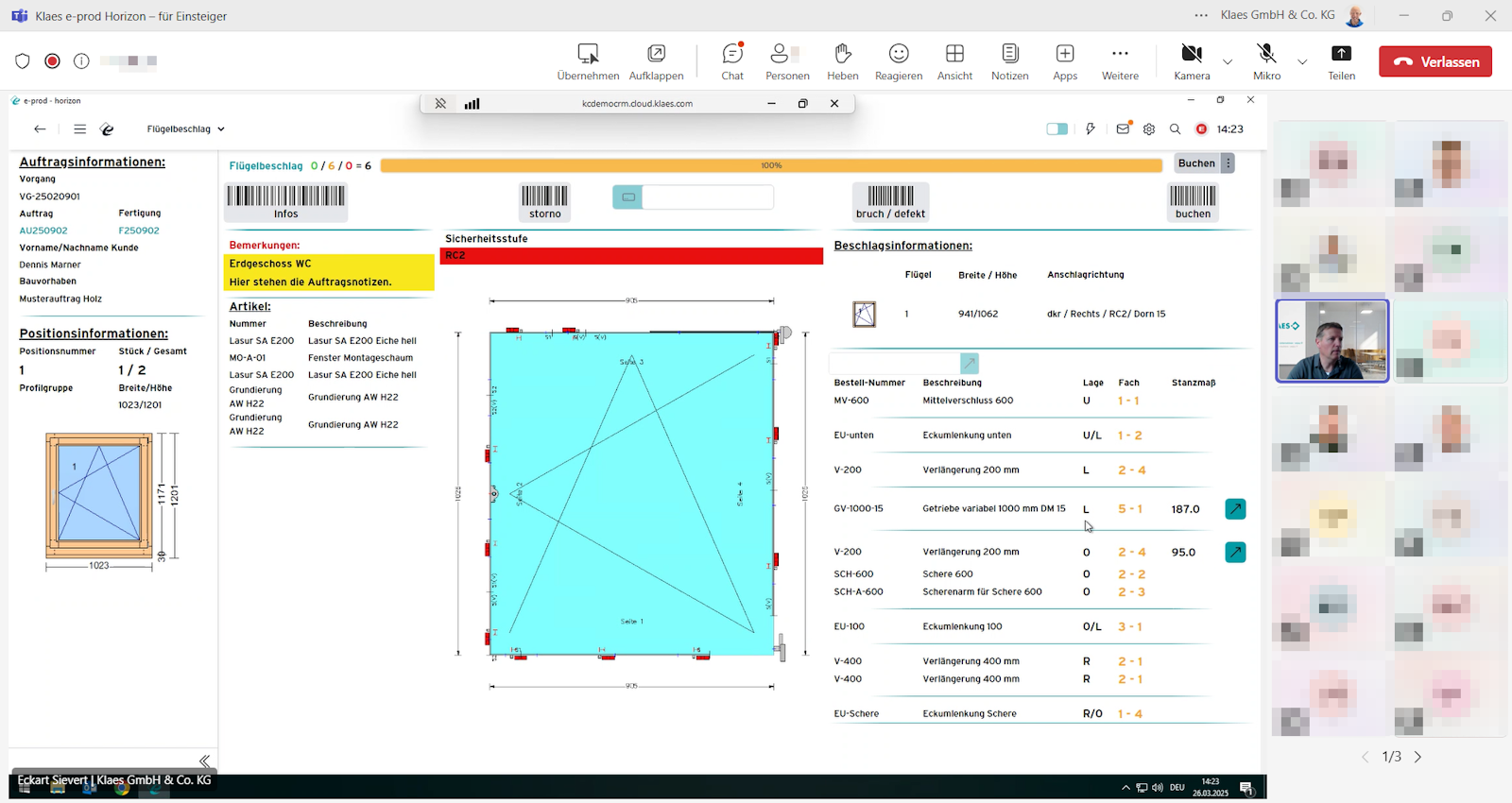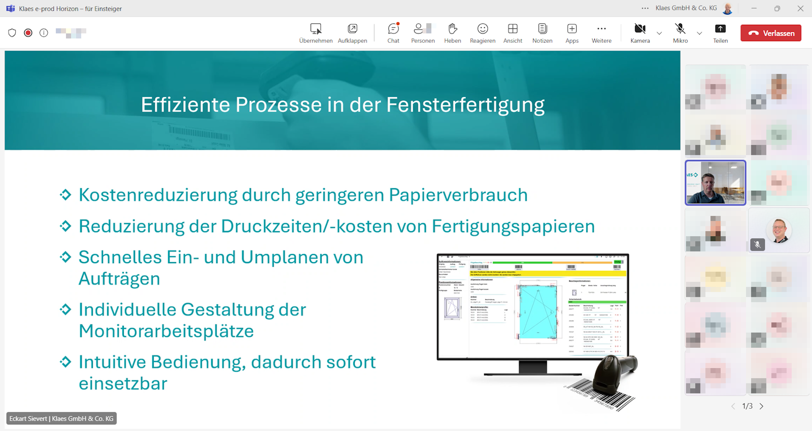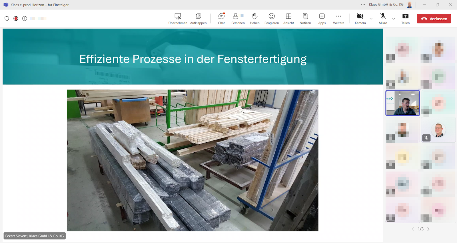 Die digitale Transformation der Fensterbaubranche schreitet weiter voran - und Klaes e-prod horizon ist eine zentrale Lösung dafür. In der Web-Präsentation am 26. März 2025 stellten Eckart Sievert (Klaes Vertrieb) und Dennis Marner (Klaes Produktmanagement) die umfangreichen Vorteile der modernen, digitalen Workfloworganisation vor.