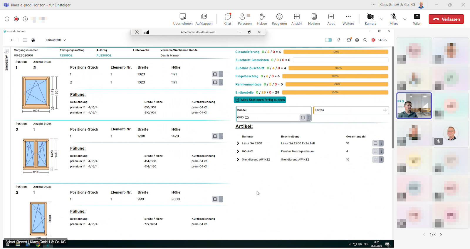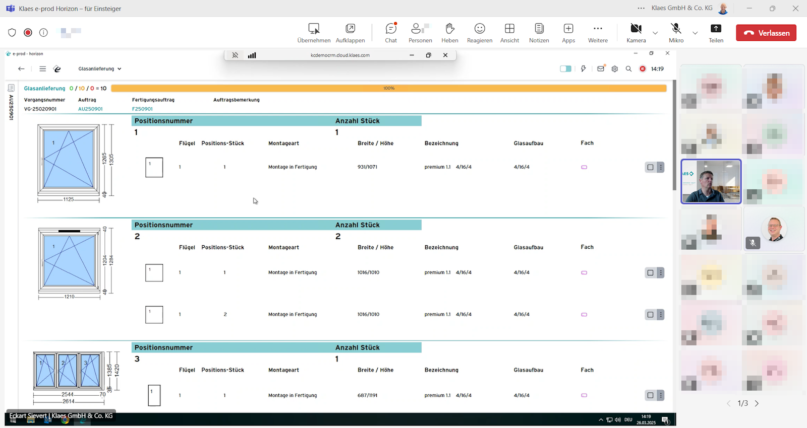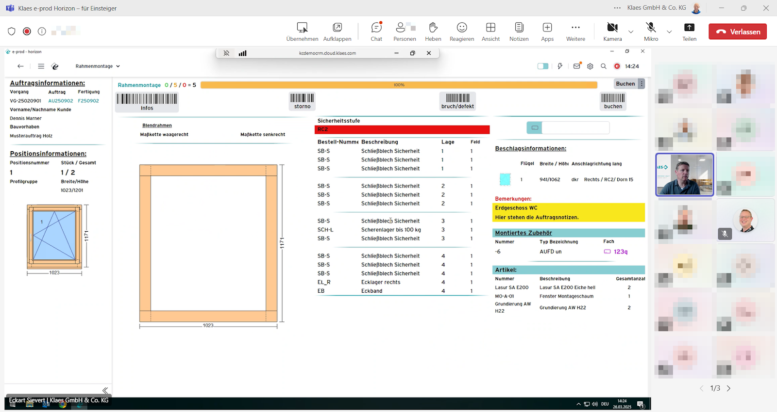 Die digitale Transformation der Fensterbaubranche schreitet weiter voran - und Klaes e-prod horizon ist eine zentrale Lösung dafür. In der Web-Präsentation am 26. März 2025 stellten Eckart Sievert (Klaes Vertrieb) und Dennis Marner (Klaes Produktmanagement) die umfangreichen Vorteile der modernen, digitalen Workfloworganisation vor.
