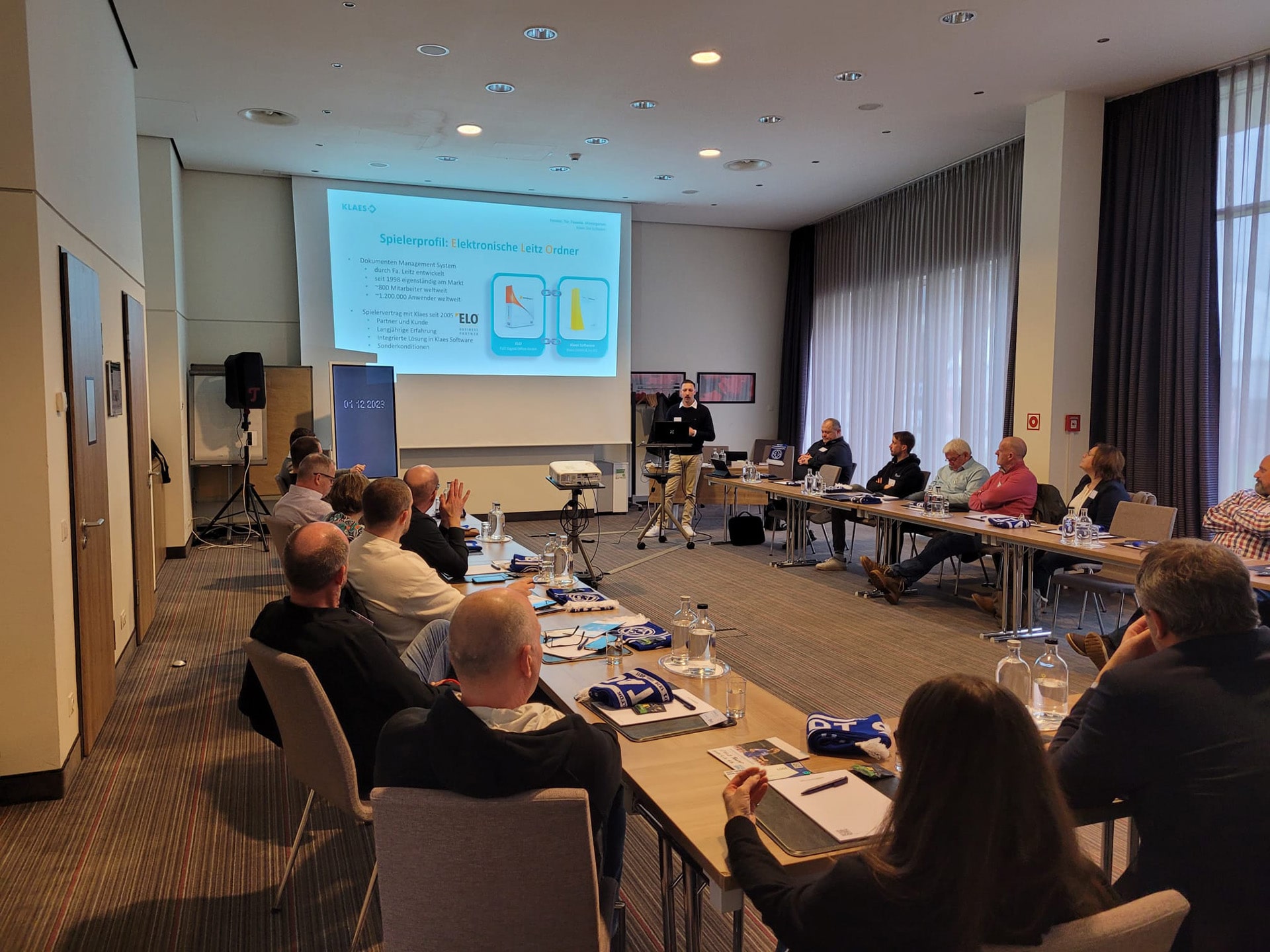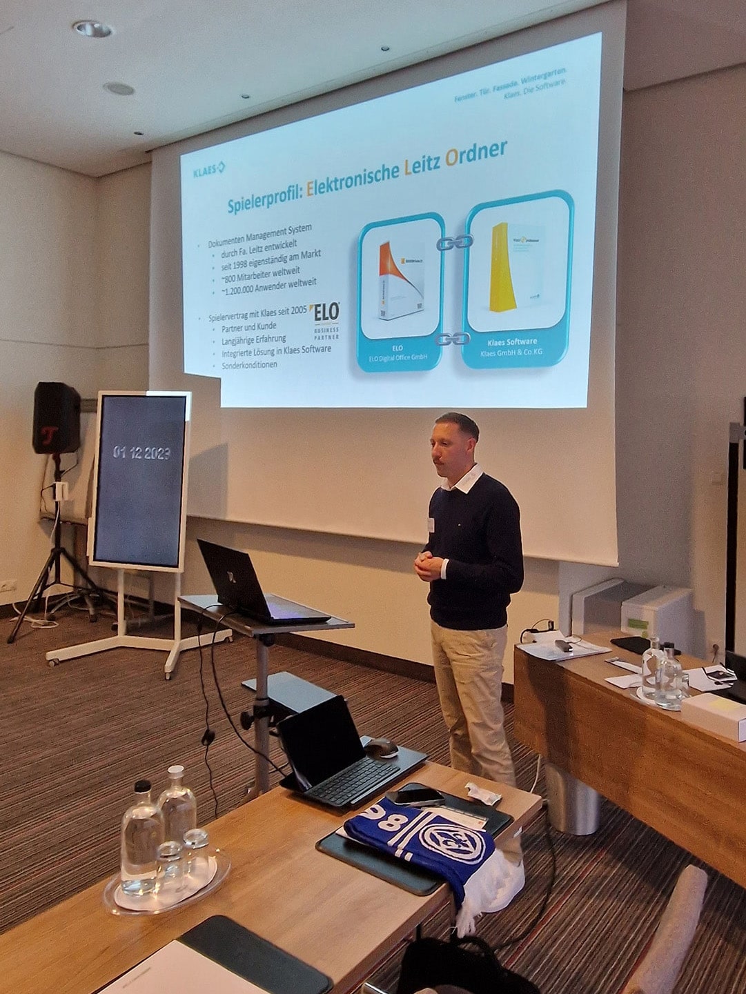 Die Veranstaltungsloge bot den perfekten Rahmen für unser Firmenevent. Das Vormittagsprogramm im WELCOME HOTEL DARMSTADT konzentrierte sich hauptsächlich auf das Thema Digitalisierung. Jens Johanni (Klaes Sales) präsentierte das Dokumentenmanagementsystem der ELO Digital Office - International, mit einer einzigartigen Integration in die Klaes-Software, sowie die Klaes Zeiterfassung und den Klaes Web-Campus. Aufgrund privater Verpflichtungen konnte unser Lilienheld Marco (Toni) Sailer der hr2 betriebliche Vorsorge GmbH und aus gesundheitlichen Gründen Sandro Sirigu leider nicht teilnehmen. Glücklicherweise sprang Harald Heinzel von der Firma GUTMANN Bausysteme GmbH mit einem Vortrag ein. Die 30 Teilnehmer, darunter 26 Klaes-Kunden, konnten in der Abgeschiedenheit der Veranstaltungsloge der Lilien ungestört Geschäftsgespräche führen und später gemeinsam den Sieg der Kölner feiern.