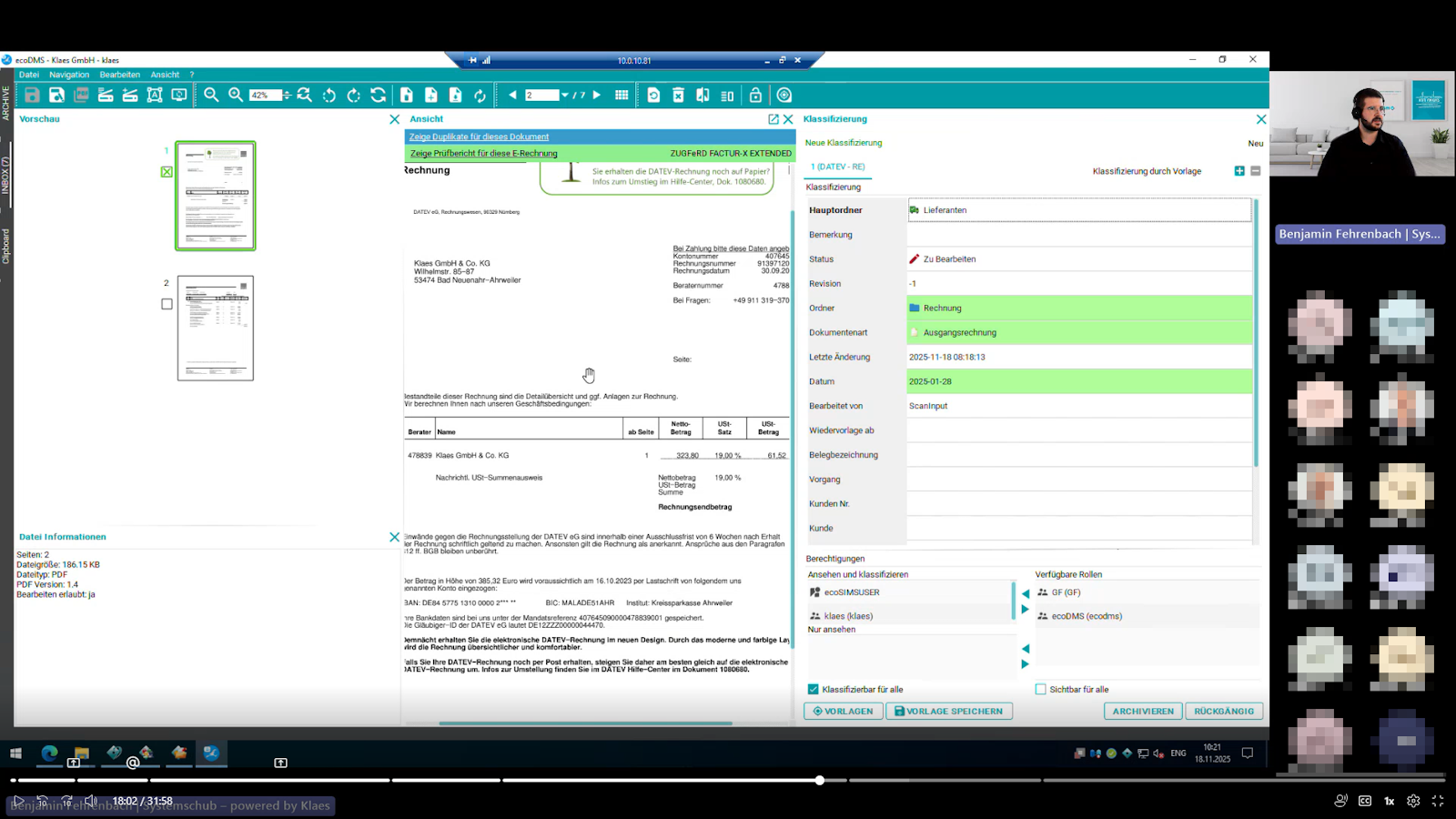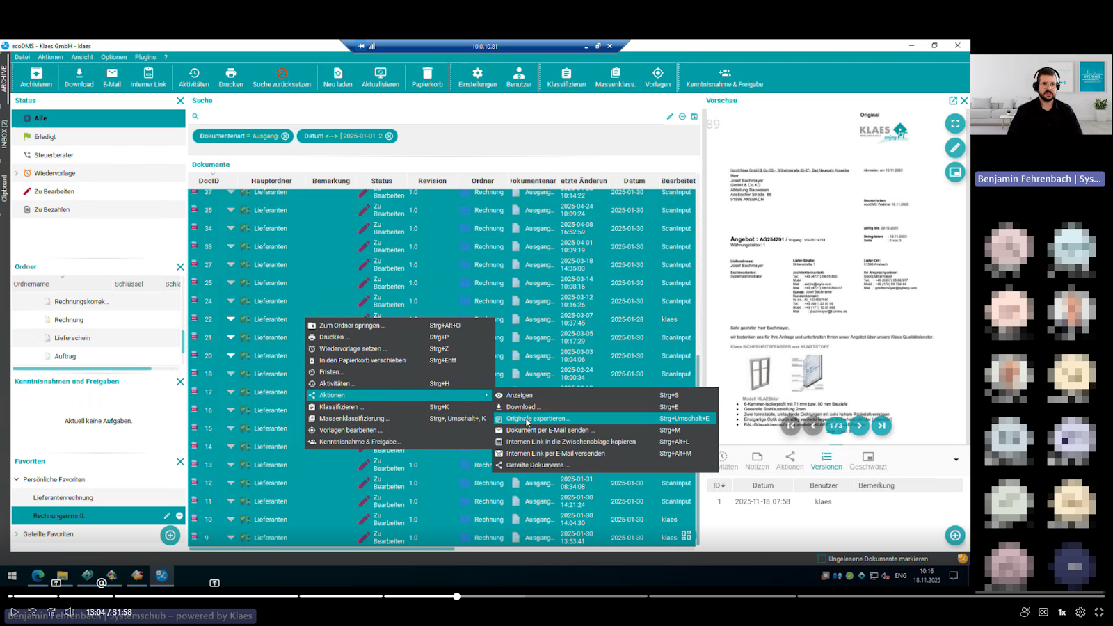 In der Web-Präsentation "Weg von der Zettelwirtschaft!" zeigte Benjamin Fehrenbach (Technischer Vertrieb IT), wie ecoDMS Unternehmen dabei unterstützt, endlich Ordnung ins Dokumentenchaos zu bringen. „ecoDMS gibt es seit 2014 – und heute setzen über 20.000 Firmen darauf“, erklärte er zum Einstieg und gab einen kurzen Blick auf die starke Partnerstruktur der Aachener Software.